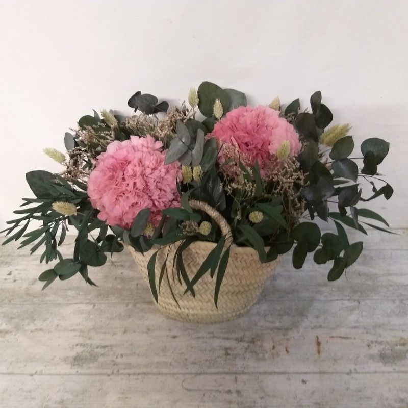 Una bonica cistella de vímet natural amb flors preservades de qualitat Premium.
