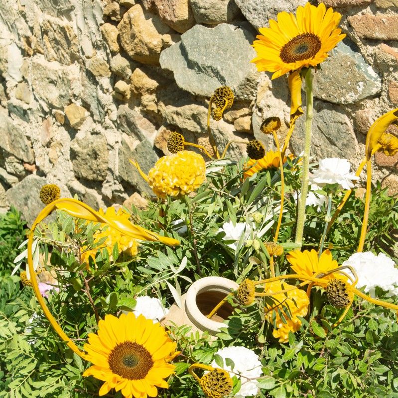 Característiques: Centre circular amb atuell de fang, base verd i ornamentat amb clavell blanc, gelosia i gira-sol.