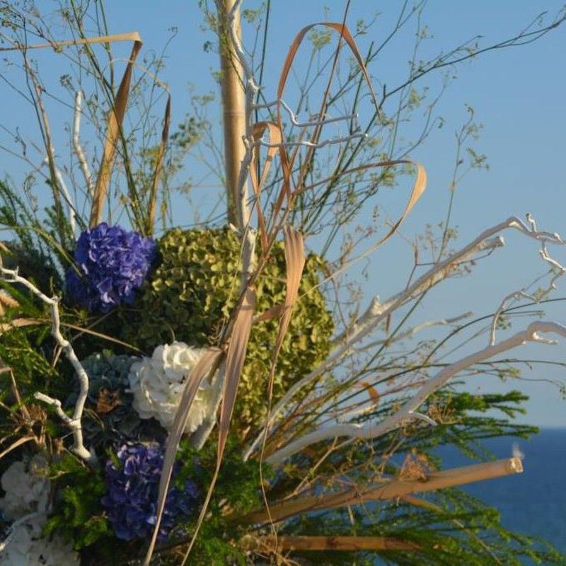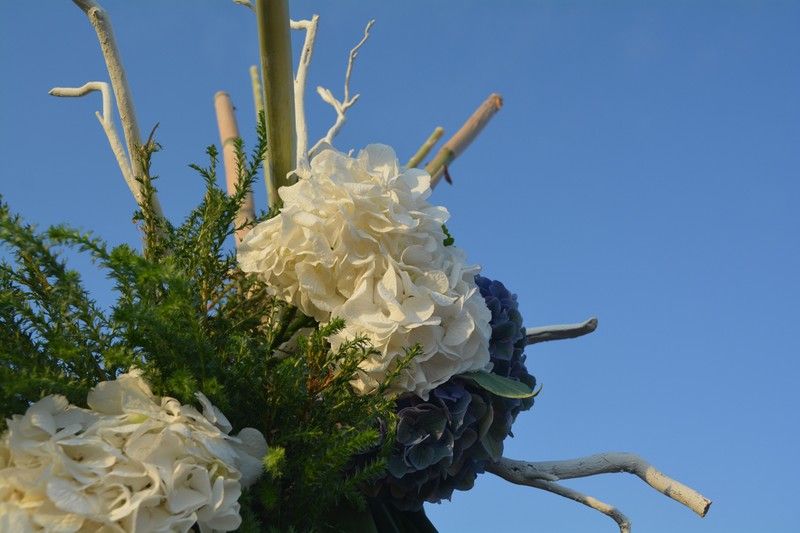Composició principal, puja o sobretaula. Eleborada amb branques d'alzina pintades al guix en blanc, canya seca, fonoll, bruc i hortènsia en blanc, verd maragda, blau i verd molsa.