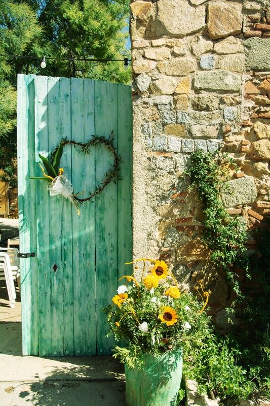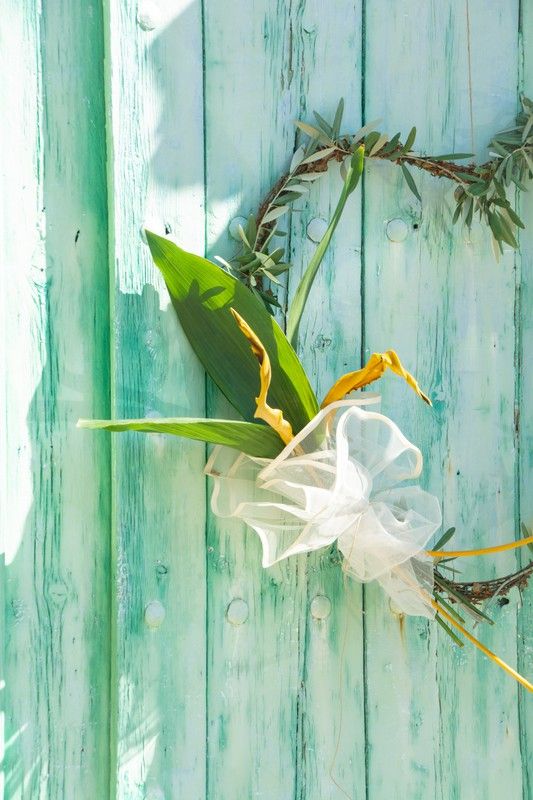 Cor olivera sobre base d'heura amb detall en ocre de fulles tintades de strlitzia