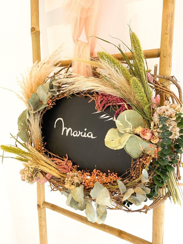 Escriu allò que no t'atreveixes a dir i embolica'l amb flors. Hortènsies, roses, espiga, pampes i verds secs. Base de pissarra ovalada.